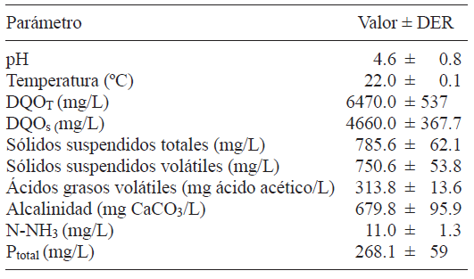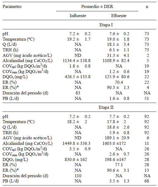 El agua residual con la que se alimentó el reactor a escala de laboratorio procedió de una industria chocolatera (Cuadro I). El reactor UASB a escala de laboratorio se operó con dos COVapl, que se identificaron como etapa experimental I (1.8 ± 0.8 kg DQOs/m3/d) y II (3.5 ± 0.9 kg DQOs/m3/d).