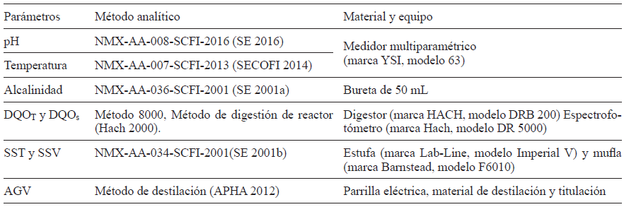 Los parámetros físicos y químicos medidos y analizados fueron pH, temperatura, alcalinidad, DQOs, ácidos grasos volátiles (AGV), sólidos suspendidos totales (SST) y volátiles (SSV). Los métodos analíticos empleados para la medición y el análisis de los parámetros físicos y químicos se muestran en el cuadro II.