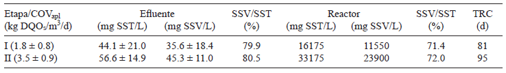 La calidad del efluente respecto a la concentración de SST y SSV en el presente trabajo fue satisfactoria y comparable con la literatura (Foresti et al. 2006, Turkdogan-Aydinol et al. 2011). La relación SSV/ SST en el efluente de las dos etapas experimentales fue de 79.9 y 80.5 %. Esta alta relación indicó que la mayor parte de los SSV fugados en el efluente provenían del lodo biológico anaerobio presente dentro del reactor.