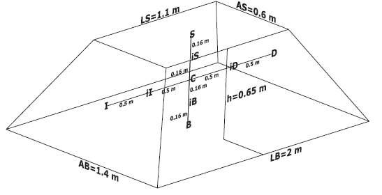 Las pilas se conformaron con la forma geométrica de una pirámide. Se estableció que las dimensiones de la altura (0.65 m) y el ancho (1.4 m) de la pila se mantuvieran fijas durante todo el proceso. El largo inicial de la base fue de 2 m, mientras que las dimensiones iniciales de la cara superior fueron 1.1 m de largo y 0.6 m de ancho. Debido a la deshidratación y degradación parcial de la materia orgánica (MO), el largo de la pila varió conforme avanzó el proceso para mantener la altura y ancho inicial de la pila. Estas dimensiones se midieron cada siete días y el volumen fue calculado con la ecuación 1 (Baldor 2004). El esquema de las pilas se presenta en la figura 1.