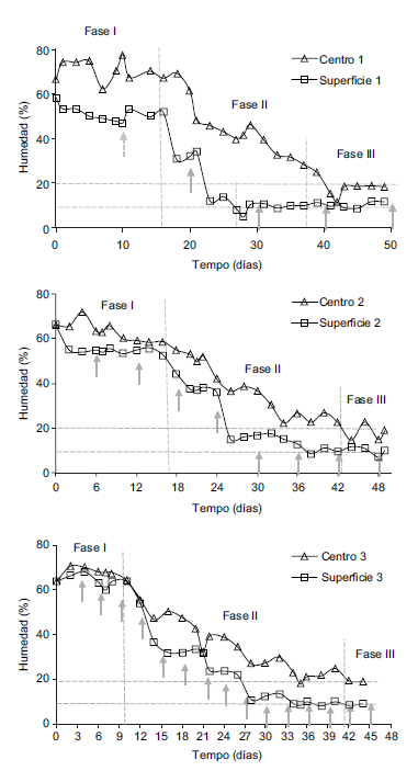 La primera fase de la pila 3, de 10 días, es la más corta, porque la mayor frecuencia de volteo provoca que la pérdida de humedad sea mayor que en las otras dos pilas, y también que la humedad de la superficie sea muy parecida a la del centro por una mayor frecuencia de mezclado. Por otra parte, una menor frecuencia de volteo aumenta la fase I a 17 días en las pilas 1 y 2, y ocasiona que la humedad de las superficies sea cada vez más baja que la de los centros en cualquier tiempo que se compare.