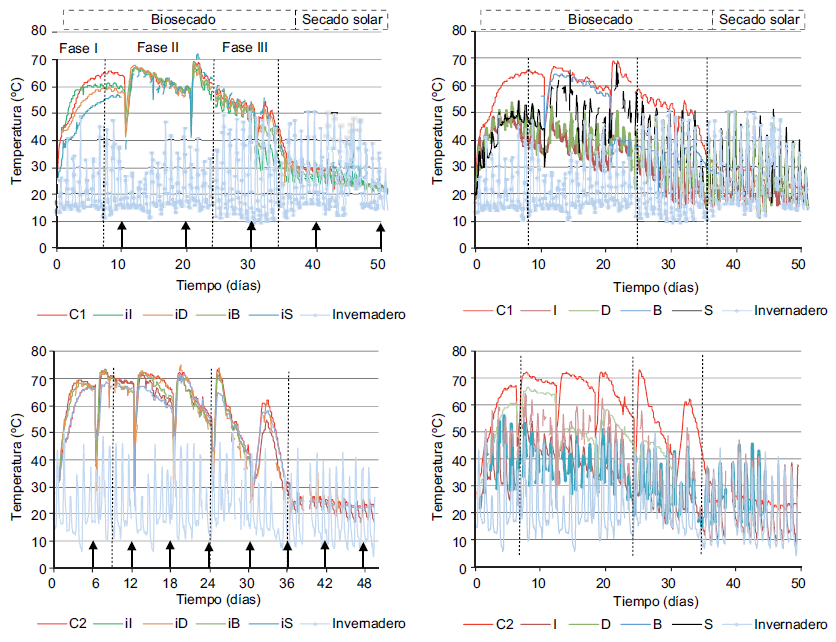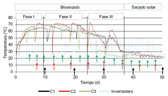 La investigación también evidenció que en la etapa de biosecado se alcanzan las temperaturas más altas del proceso: 65 ºC para el centro de la pila 1. Una frecuencia de volteo de cada tres o seis días provoca temperaturas aun mayores: 71 ºC en el centro de las pilas 2 y 3, debido a una mayor oxigenación. Las temperaturas de las caras superficiales de las pilas varían de 30 a 55 ºC aproximadamente. Estas temperaturas son dependientes tanto del calor microbiano como de la temperatura dentro del invernadero. La etapa del biosecado termina cuando se acaba la actividad microbiana; a partir de ese momento, la temperatura desciende drásticamente porque ya no hay aporte de calor microbiano.