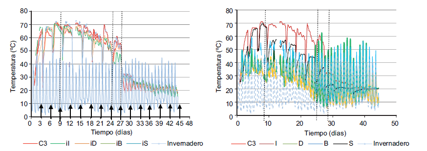 Se puede observar que el centro y las capas internas de cada pila (C, iI, iD, iB, iS) registraron las mayores temperaturas, seguidos por la cara base (B), que no tiene salida de calor, después por la cara superior (S), que recibe directamente la radiación solar, y al final por las caras laterales (I y D), que están en contacto con el ambiente del invernadero. Lo anterior concuerda con lo reportado por Rada et al. (2007), quienes también afirmaron que el centro de la pila era el punto más caliente y las superficies las de menor temperatura.