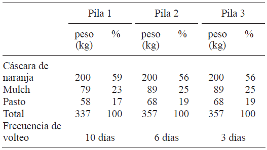 Se evaluó el efecto de la frecuencia de volteo en el biosecado de tres pilas de 350 kg cada una, las cuales fueron conformadas por una mezcla de residuos orgánicos compuesta por cáscaras de naranja, residuos de poda triturados (mantillo, que funcionó como agente estructurante) y pasto. La frecuencia de volteo fue cada 3, 6 y 10 días para las pilas 3, 2 y 1, respectivamente.