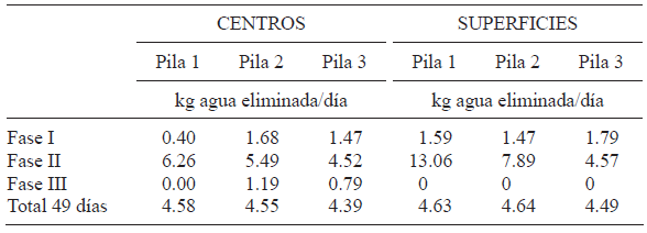 Finalmente, en el cuadro II, se muestran las velocidades de secado calculadas con los resultados mostrados en esta sección del trabajo. Claramente se observa que en la fase II se lleva a cabo prácticamente todo el secado de las pilas, tanto en el centro como en la superficie. La mayor velocidad de secado en esta fase se presenta en la pila 1 (centro y superficie), que es la de menor frecuencia de volteo.