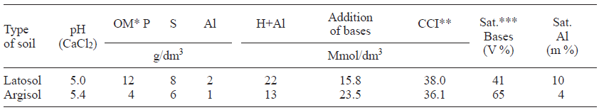 The highest DM values (p < 0.01) in the Latosol were related to physical-chemical characteristics of this soil (Table I). In it, organic matter (OM) was three times higher than OM in the Argisol. According to Medina-Méndez et al. (2017), OM provides multiple benefits to the soil, as a nutrients supply, influencing positively on crop yield.
