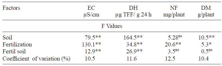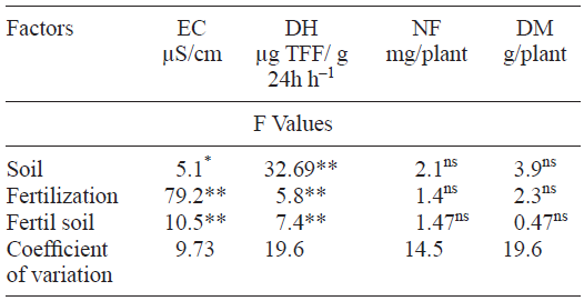 In corn crops DM, DH and EC were significantly different (p < 0.01) between soils. All the variables measured had significant differences (p < 0.01) regarding fertilization factor. Significant interaction was observed between the two factors (soil and treatment) for EC and DH, but not for NF and DM (Table II). The soil type did not have influence in NF, but the fertilization factor did have. The plants treated with urea and non-fertilized ones had the highest and lowest NF values respectively (Table III).