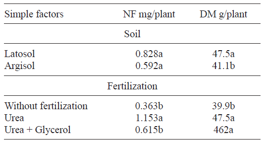 In the treatment applied to the corn and sorghum plants cultivated in a polyethylene pots with two different soil types (Latosol and Argisol), an interaction between the studied factors (soil types and fertilization) was found for the variables dehydrogenase and electric conductivity measured in the soil. The differences observed between the media values in DH and EC amongst the non-fertilized plants, the treatment with urea and with urea + glycerol were not the same in Argisol and Latosol.