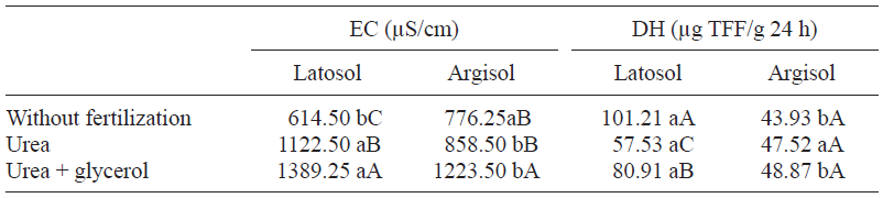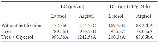 The highest DH values in the urea + glycerol treatment in the Latosol were related to the contribution of raw glycerol to the soil fertility due to the positive impact of glycerol in the development of microorganisms (Betancourt et al. 2016). Additionally, in the Latosol used in this research the OM values were found to be thrice higher to those found in the Argisol (Table I). OM increases the microbial biomass and the enzymatic activity in the soil (Mahajan et al. 2016), aspects that agree with the results obtained in this research.