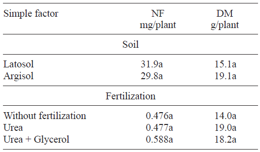 DM highest values were registered in Latosol, and with urea and urea + glycerol treatments (p < 0.01) (Table III). In these fertilization treatments DM values were similar (p > 0.01), so the addition of glycerol did not affect this variable.