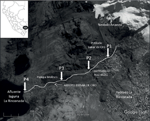 Se tomaron muestras de aguas superficiales según el Protocolo de Monitoreo de Recursos Hídricos Superficiales del Perú (ANA 2011) y sedimentos según Chen et al. (2012). Las muestras se obtuvieron en cuatro puntos del arroyo: P1, atravesando el poblado Lunar de Oro a 4732 msnm; P2, adyacente a la quebrada La Rinconada a 4720 msnm; P3, en el sector Pampa Molinos a 4655 msnm, y P4,) afluente de la laguna La Rinconada a 4557 msnm (Fig. 1). La distancia entre puntos de muestreo fue de aproximadamente 500 m.