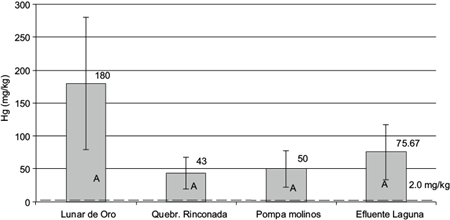 En el 100% de los muestreos las concentraciones de mercurio en sedimentos superaron ampliamente el valor de referencia de 2 mg/kg, a partir del cual este metal causa efectos severos en la mayoría de los organismos bentónicos (SEL por sus siglas en inglés) o los 0.486 mg/kg que constituyen el límite de exposición para seguridad ocupacional y administración de salud (PEL) de la Administración Nacional Oceánica y Atmosférica de los Estados Unidos (NOAA por sus siglas en inglés) (Buchman 2008). Destacan los 180 mg/kg de mercurio para el sector Lunar de Oro, que superan 186 veces lo establecido por la NOAA para SEL y 373 veces para PEL. Los CEQG (1997) establecen como guía 0.17 mg/kg de sedimentos para la protección de la vida acuática, en tanto que el programa nacional de calidad del agua para irrigación de los EUA (NIWQP 1998) indica que contenidos de 0.24 mg/kg ocasionan impactos subletales y deterioro de la capacidad reproductiva en peces. Los resultados del presente estudio superaron ampliamente estas pautas, demostrando que el arroyo evaluado mantiene en su lecho cantidades de mercurio potencialmente ecotóxicas.