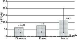 Todas las muestras de sedimentos presentaron elevados valores de mercurio, desde 9 hasta 373 mg/kg. El promedio más alto fue de 180 ± 100.56 mg/kg para inmediaciones a Lunar de Oro, 75.67 ± 42.27 mg/kg en la afluencia de la laguna La Rinconada, 50 ± 27.93 mg/kg en Pampa Molinos y 43 ± 24.02 mg/kg para la quebrada La Rinconada (Fig. 2), aunque sin diferencias significativas entre ellos (F3,6 = 1.23; p = 0.379), lo que explicaría una sedimentación similar en todo el lecho del arroyo evaluado. Tampoco se evidenciaron diferencias entre meses (F2,6 = 0.32; p = 0.737), promediando 118.75 ± 85.95 mg/kg para marzo; luego, enero y diciembre alcanzaron medias de 78 ± 18.46 mg/kg y 64.75 ± 14.94 mg/kg, respectivamente (Fig. 3). En sus dos muestreos en el arroyo, Gammons et al. (2006) reportan valores de 228 mg/kg cerca al poblado Lunar de Oro y 232 mg/kg en el sector Pampa Molinos, coincidiendo cercanamente con algunos de nuestros reportes.