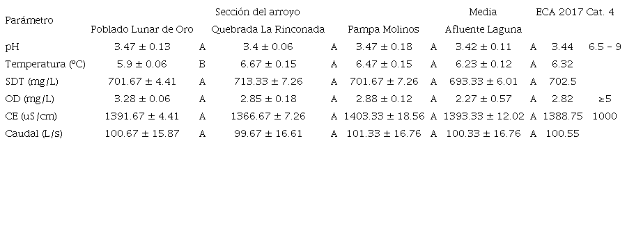La temperatura promedio de 6.3 ºC de las aguas del arroyo es característica de un ambiente muy frío, siendo más frígidas aún en la sección más cercana al glaciar (F3,8 = 7.235; p = 0.011) (Tuckey p < 0.05), promediando 5.9 ºC. Los SDT promediaron 702.5 mg/L y no difirieron entre lugares de muestreo (F3,8 = 1.678; p = 0.248). Estos valores se consideran elevados y evidencian la presencia de partículas y iones en abundancia, principalmente de origen inorgánico (Basha et al. 2008, Sarabia-Meléndez et al 2011). La conductividad eléctrica superó los 1300 uS/cm, cuando la mayoría de los ríos altoandinos presentan promedios entre 21.45 y 143.81 uS/cm (Villamarín et al. 2014), rebasando en 40 % el valor límite establecido en los ECA, lo que indica también altas concentraciones de sales, minerales y iones (Moore et al. 2008), con una elevada posibilidad de transportar metales pesados.