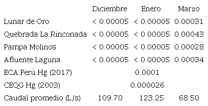 El mercurio en todas las zonas y meses alcanzó valores desde < 0.00005 mg/L hasta 0.00043 mg/L, discurriendo por el arroyo en concentraciones más o menos homogéneas durante diciembre y enero (< a 0.00005 mg/L), y difiriendo sólo en marzo, cuando los valores fueron desde 0.00028 mg/L en Pampa Molinos hasta 0.00043 mg/L en la quebrada La Rinconada. El promedio general fue de 0.00034 ± 0.000032 mg/L para este mes (Cuadro II).