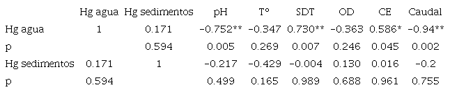 Correlaciones entre el mercurio del agua superficial y del sedimento no evidenciaron ningún nivel de asociación (r = 0.17; p = 0.594) (Cuadro III); es decir, el mercurio en sedimentos no determina los niveles del agua superficial o viceversa, por tanto estos valores fueron independientes entre sí. Guzmán-Colis et al. (2011) confirman también la ausencia de correlación entre ambos valores en un estudio similar.