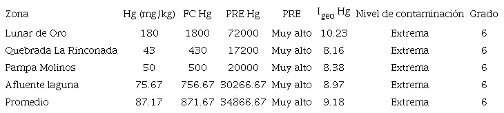 El índice Igeo muestra la misma situación, calificando todo el ámbito como un ecosistema “extremadamente contaminado” con mercurio, con un valor promedio de 9.18, siendo los tramos más contaminados Lunar de Oro con 10.23 y la desembocadura a la laguna con 8.97; los sectores adyacentes a La Rinconada y Pampa Molinos presentaron valores de 8.16 y 8.38 respectivamente (Cuadro IV).