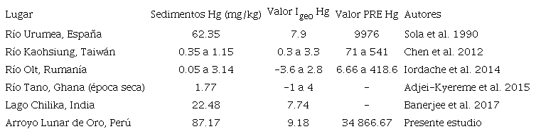 En el cuadro V se comparan los índices de este estudio con los de otros ríos y arroyos relacionados a actividades de minería e industrias en diferentes partes del mundo. Resalta que aunque existen otros ecosistemas acuáticos con importantes niveles de contaminación por mercurio, ninguno supera lo acontecido en el arroyo Lunar de Oro en los valores PRE e Igeo.