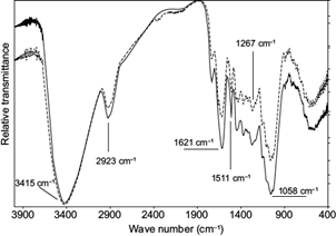 The composition of SR was as follows: ash 1.88 %, total extractives 6.06 %, lignin 45.38 % and holocellulose (hemicellulose + cellulose) 46.68 % (calculated by the difference). These results are recorded in literature in relation to the estimated composition of the bark of conifers (Rowell 2013). Regarding the infrared spectroscopy analysis, both SR and SB spectrums (Fig. 1) presented strong signal bands to OH groups intermolecular interaction (3415 cm-1) and C-H bond stretching (2923 cm-1). The peaks at 1510 and 1610 cm-1 correspond to the C=C aromatic ring skeleton stretching vibration and the peak at 1054 cm-1 corresponds to the C-O-C pyranose stretching. The peaks obtained are features to groups on carbohydrates and lignin, the major components in bract composition (Silverstein et al. 2005, Kumar et al. 2014, Liu et al. 2014).