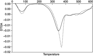 These signals show the presence of important polar groups in the biosorbent chemical composition. The polar groups can strongly interact by hydrogen-bonding and/or dipole-dipole interactions with compounds that possess, for example, O-H and N-H, in their chemical structures. The SR spectrum is similar to SB, indicating that the main lignocellulosic groups of biosorbent were not modified by the boiled treatment. Differential thermogravimetric analysis (DTGA) showed that SR has a lower thermal stability (182 ºC) than SB (204 ºC) (Fig. 2). This higher degradation temperature for SB can be attributed to boiled treatment that might remove or degrade the phenolic compounds. In fact, when SR is put in water, the solution becomes colored after a few minutes. This happens because its soluble phenolic compounds move to the aqueous solution. Boiling removed these compounds from SR and reduced its mass nearly by 14 %. Because of these facts, only SB has been used in rhodamine B biosorption studies.