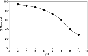 The chemical balance of biosorption between the biosorbent and the dye was reached after 2 h of contact. This time was used for all the equilibrium experiments performed in this work. The effect of pH on biosorption of rhodamine B by SB is showed in figure 3. The removal capacity of rhodamine B by SB was greater than 80 % at pH lower than 5. The minimum removal occurred at pH 10 with approximately 30 %.