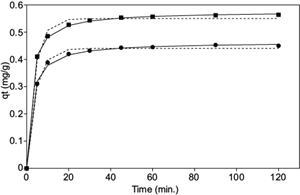 To investigate the kinetic behavior of the biosorption, experimental data obtained for the contact time was applied to the kinetic models of pseudo first order (equation 2) and pseudo second order (equation 3) (Lagergren 1898, Ho and McKay 1998):