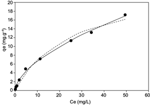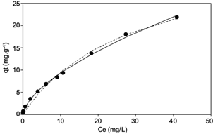 where qe represents the mass removed by biosorbent at chemical equilibrium (mg/g), Q the maximal biosorption capacity (mg/g), Ce the dye concentration at equilibrium (mg/L), KL (L/mg), and KF (mg1-β /g.Lβ) the Langmuir and Freundlich equilibrium constants, respectively. β is a thermodynamical parameter related to mutual interaction among molecules of dye absorbed.