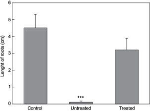 The evaluation of SB to treat wastewater was made using a synthetic wastewater containing commercial rhodamine B obtained from a local timber industry where the dye is dissolved in water (125 mg/L) and is stored in a big tank, which is used to dye plywood by dipping. Plywood is a sheet material manufactured from thin layers of softwood and it is dyed to identify its commercial application. The rhodamine B commercial sample was investigated by spectroscopy and showed similar characteristic bands as the analytical grade dye, which confirm its chemical identity. Treatment of synthetic wastewater containing rhodamine B within SB removed 96 % in the mass of dye (qe = 4.95 mg/L). After this, the treatment performance was evaluated by toxicity bioassays. Untreated wastewater containing the dye caused significant growth inhibition on roots of A. cepa (Fig. 7). This phytotoxic effect could be related to bioaccumulation of rhodamine B in plants and interactions with specific areas in the meristematic cell nucleus. Due to this, different kinds of physiological, biochemical and molecular effects can be initiated, including mitotic activity change, nuclear aberration (e.g., micronucleus, nuclear buds and bridged nuclei) and oxidative stress (Tan et al. 2014).