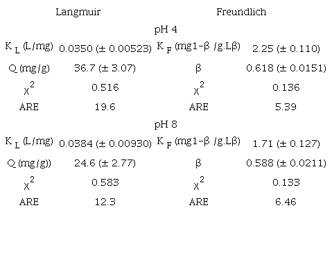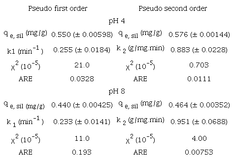 The experimental data to kinetics and biosorption isotherm models were simulated by a non-linear method using tools provided in the Microcal Origin 5.0 software. Simulated qe (qe, sil ) were generated from formulae of various kinetics or isotherm models. Both qe, sil and the experimental data (qe ) were fitted into a chi-square test (χ2 ) and average relative error equations (ARE) for error analysis (equation 6). The smallest value indicates the least error model into to the experimental data (Kooh et al. 2016).