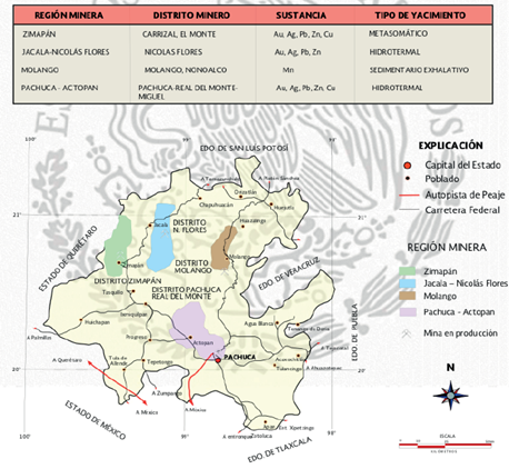 El estado de Hidalgo presenta una gran variedad de yacimientos, tanto metálicos (e.g., manganeso, plomo, plata, cobre, oro) como no metálicos (e.g., caliza, yeso, caolín, diatomita, piedra pómez, mármol, etc.). El desarrollo de la industria minero-metalúrgica comenzó hace aproximadamente 500 años (Labastida 2014).