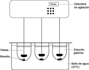 Las muestras se colocaron en un equipo Vankel a 37 ºC (Fig. 3) con seis vasos disolutores calibrados (exactitud ± 1 %) con 400 mL de una solución gástrica preparada según el método de Ruby et al. (1996), como se muestran en la figura 3. La extracción se dejó reposar durante 10 min; posteriormente se agitó a 100 rpm, velocidad que garantiza un patrón hidrodinámico para evitar turbulencias que alteren el tamaño de partícula. Como indica el método, la solución inicial se debe desgasificar para evitar la presencia de gases disueltos en el medio de disolución. Pasados los 10 min de agitación se tomó una alícuota de 20 mL utilizando una jeringa y se repuso el volumen con solución gástrica. Éste paso se repitió a los 40 y 60 min. Una vez que se tomó la última muestra, las soluciones de los digestores se llevaron a un pH de 7 utilizando bicarbonato de sodio (polvo JT Baker QP) y se agregaron 700 mg de sales biliares (Sigma-Aldrich grado microbiológico) y 200 mg de pancreatina (Sigma-Aldrich grado USP) para emular las condiciones intestinales. Se tomaron dos alícuotas más a los 120 y 240 min. Todas las alícuotas se obtuvieron con filtros de nitrocelulosa de 0.45 µm y se centrifugaron a 3500 rpm durante 15 min.