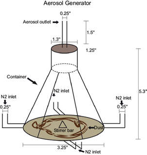 El experimento consistió en la generación de un aerosol que permitiera transportar la muestra sólida, intentando simular condiciones de levantamiento de polvos por medio de un equipo generador de turbulencias acoplado a un sistema de aire comprimido (Fig. 4). El aire comprimido funciona como gas acarreador acompañado de agitación magnética para generar la suspensión en fase seca a partir de la muestra sólida. El equipo está construido con acero inoxidable para evitar interacciones electroestáticas entre sus paredes y las partículas en suspensión (Ladino y Abbatt 2013).