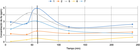 Una vez que se obtuvieron los resultados de la concentración de As total en cada muestra, se seleccionaron cinco muestras para la prueba de biodisponibilidad in vitro, las cuales presentaban las concentraciones más bajas y las más altas, siendo éstas las muestras 1, 2, 5, 6 y 7.