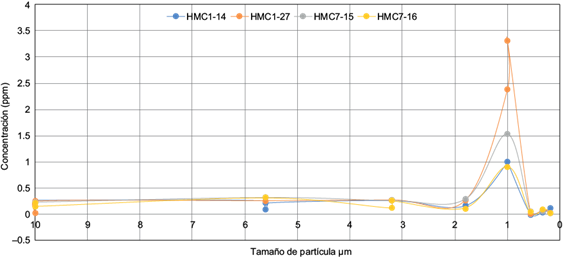 En la última parte del experimento se llevó a cabo el análisis químico por medio de EAA, con el fin de determinar la concentración de arsénico. Los resultados arrojados por esta técnica se determinaron en mg/kg y se graficaron en función del tamaño de partícula para observar la relación que guardan estas variables (Fig. 8). Se pudo observar que la mayor concentración de partículas se encuentra en las etapas centrales, la cuales corresponden al rango de tamaños de partícula de 1.8 a 0.56 µm. Lo anterior da una idea del tipo de partículas que conforman la muestra, las cuales en este caso corresponden a los modos de acumulación y en la distribución de tamaño (Lohmann et al. 2016).