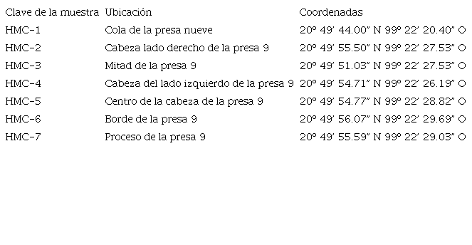 El muestreo fue realizado por el personal de la mina, quienes tomaron siete muestras en diferentes puntos de la presa de jales 9, la cual tiene una extensión de poco menos de media hectárea (Fig. 2). Las coordenadas de los puntos de muestreo se indican en el cuadro I.
