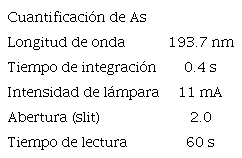 Para cuantificar el As se empleó la técnica de EAA-GH por el método USEPA 7061A (USEPA 1992). La cuantificación se realizó en un espectrofotómetro Perkin Elmer AAS 2380 equipado con un sistema de generador de hidruros MHS-10. Los parámetros utilizados para el análisis se muestran en el cuadro II. Todas las soluciones se prepararon con agua desionizada (18 MΩ × cm, Millipore Milli-Q). Se utilizó un estándar de alta pureza de As de 1000 μg/mL. El As se almacenó a 4 ºC y las diluciones se prepararon diariamente para cada análisis.