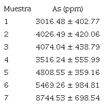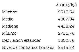 Los resultados de la determinación de la concentración total de As contenido en los jales arrojaron valores por encima de los límites establecidos en la NOM-147-SEMARNAT/SSA1-2004 (SEMARNAT 2007), la cual establece260 ppm como límite máximo permisible para un suelo de uso industrial. En el cuadro III y la figura 6 se puede observar que las concentraciones en las siete muestras sobrepasan las 3000 ppm. Los principales estadísticos que describen el comportamiento de los niveles de As en las muestras estudiadas se indican en el cuadro IV.