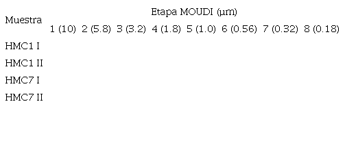 Los resultados obtenidos durante la separación y recolección de partículas de aerosol por tamaño con el MOUDI se muestran en el cuadro V. Se observa que fue en la etapa 5 del recolector de partículas cuando se reunió la mayor cantidad de muestra. Esta etapa corresponde a un tamaño de partículas de 1 µm.