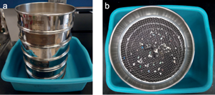 According to the objectives of the research, the microplastics could be further divided by sizes using different sieves (mesh 4, 5, 6, 7 y 16; 4.75, 4.00, 3.35, 2.83 and 1.13 mm, respectively, or similar sizes) (Fig. 10 a and b). This segregation will create sub-categories in the 5.00-4.01 mm, 4.00-3.01 mm, 3.00-2.01 mm and 2.00-1.00 mm ranges.