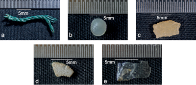 There are different ways to describe the shape of a microplastic particle. A very comprehensive one is the proposed by Laglbeuer et al. (2014), which classifies microplastics as fibers, pellets, rigid fragments, foams and films (Fig. 11 a, b, c, d and e). The identification is made visually and can be improved with a microscope. Films are distinguished from rigid fragments by their flexibility, and foams by their ease of compression.