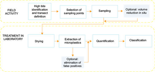 Figure 2describes the procedure, which can be divided into two phases. The first phase is fieldwork and includes three stages: location of high tide line and selection of transect, random selection of sampling points and sampling. The second phase, performed in the lab, includes drying, extraction of microplastics, classification and quantification.