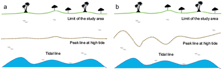 Distribution and transport of waste and microplastics in beaches are highly influenced by the tides. It is advisable to do the sampling over the high tide line, where waste and sediments tend to accumulate. The shape of the high tide line will vary according to the shape of the beach. However, it will present an oscillatory pattern. Sometimes tide lines are almost linear (Fig. 3a), while other times oscillations are highly marked. In some cases, the lines show a heterogeneous pattern (Fig. 3b).