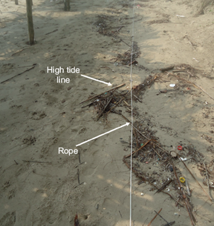 Microplastics tend to accumulate along the high tide line, due to the effect of the surge. Sampling must be done along a 100 m segment of the high tide line (transect), where it is clearly visible (Fig. 4). In some cases, more than one high tide line can be found, then the line located farthest must be selected, as it will be less disturbed (Fig. 5a). The selected transect is then marked with a 100 m rope fixed with stakes. Five-meter segments can be previously marked in the rope, to ease the measurement of distances in the field (Fig. 5b). The rope must follow a straight path that traces the direction of the high tide line, even if it does not touch the line in all their length.