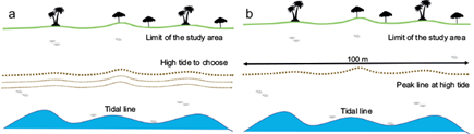 The area of study must be defined by the objectives and scope of the research. It is recommended to focus on the area comprised between the tide line at the time of sampling (defined by the waves) and the limit set by dunes, vegetation or infrastructure.