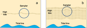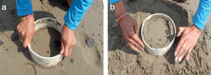 If the width of the high tide line is smaller than the sampler diameter, the cylinder must be aligned to ensure that the sediments and microplastics are kept inside it (Fig. 7a). Sometimes the tide lines are not well defined and can be wider than the sampler; in that case, the cylinder must be aligned with the border that is farther from the water (the most undisturbed zone; Fig. 7b).