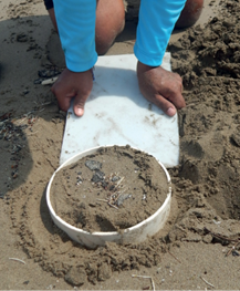 The sampler must be plunged applying pressure from the top to bottom until its upper edge reaches the surface of the sand. This action will be easy to do in beaches with coarse sand, while beaches with fine and compacted sand will require a circular movement to introduce the cylinder (Fig. 8a). The process can be eased by removing the sand around the sampler or by using a rubber gavel (Fig. 8b).