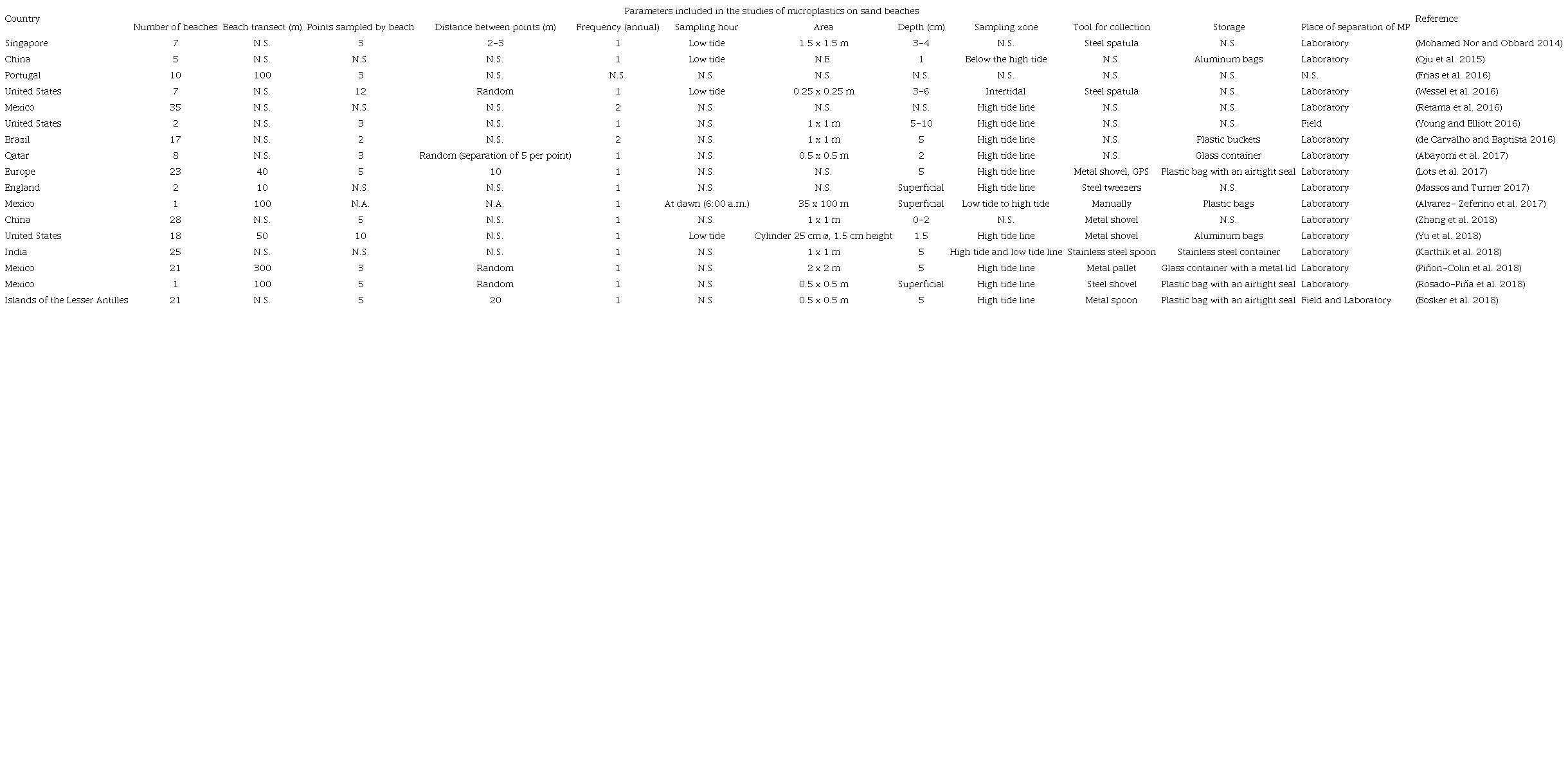 The results are shown in table I. It can be observed that the number of beaches sampled varied from 1 to 35, with an average of 13, while sampling points go from 2 to 12, with an average of 4.9. Only four papers define the length of the sampled transect (10-300 m), and they do not state the distance between sampling points. Sampling is usually done in the high tide zone (where sediments accumulate), where the higher concentration of microplastics is found (Cole et al. 2011, Lavers and Bond 2017).