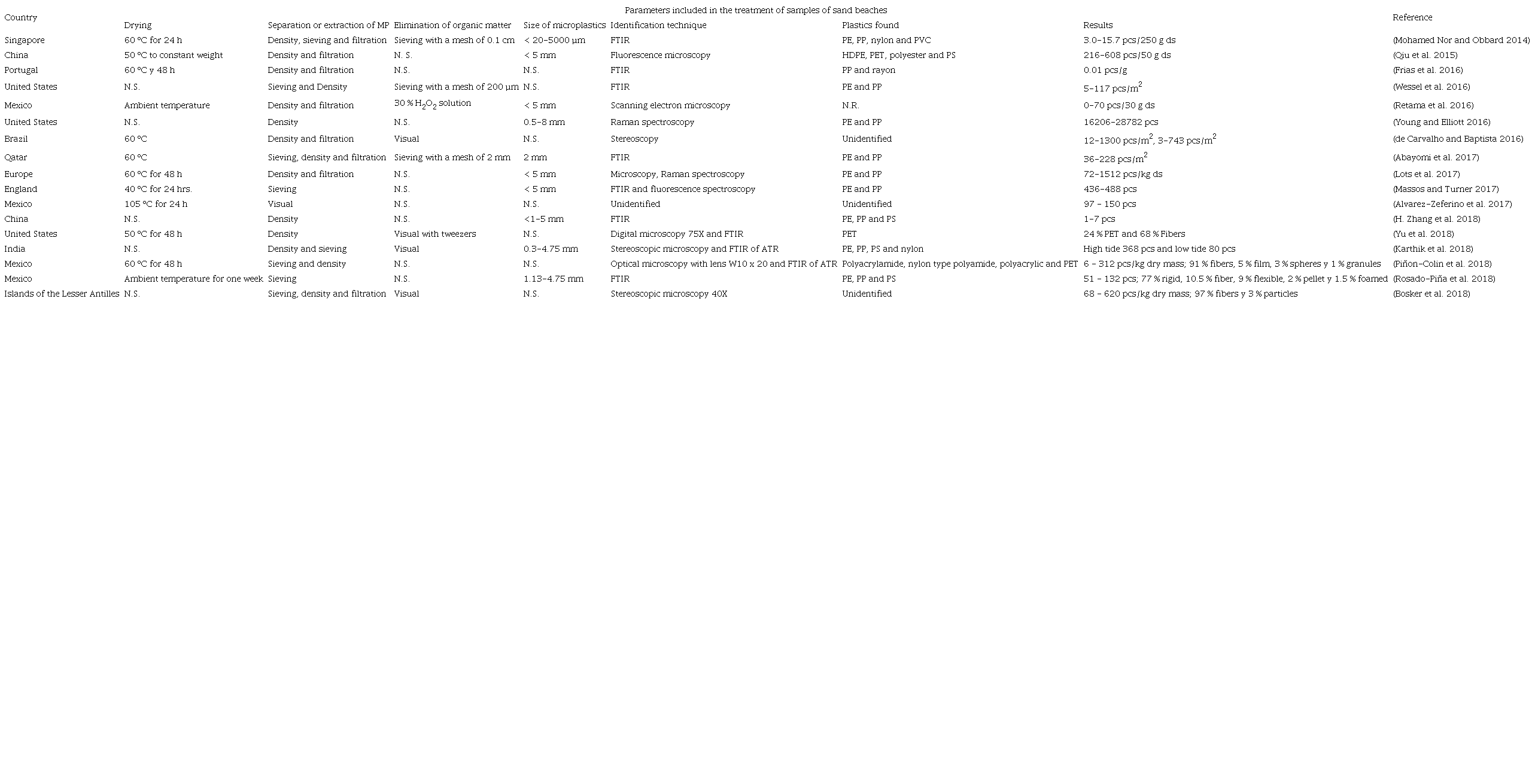 The drying of the sand samples eases their management and allows to report results both, in wet and dry basis. In the reviewed papers it was done from room temperature to 105 ºC, lasting from 24 h up to one week. The techniques used to extract microplastics from sand were density separation (using solutions with different densities which allow plastics to float), sieving and filtration. Identification was usually performed by Fourier transform infrared spectroscopy (FTIR) and microscopy. The plastics found in higher frequency were PE and PP.