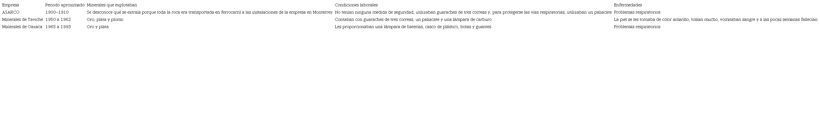 Los registros de las condiciones laborales son escasos, en su mayoría relatos. Algunos mineros que trabajaron en ASARCO fueron los padres y abuelos de los mineros que, durante la primera mitad del siglo XX, trabajaron en las empresas Minerales de Taviche y Minerales de Oaxaca, ambas de capital canadiense. En todas estas empresas, las condiciones laborales eran precarias.