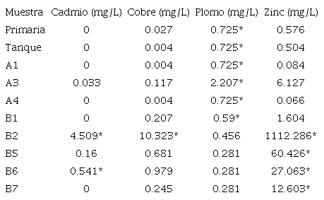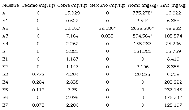 Tanto las muestras como los blancos se analizaron por triplicado. Las lecturas de metales pesados se realizaron por espectrofotometría de absorción atómica (Perkin Elmer AAnalyst). Se cuantificaron cadmio, cobre, mercurio, plomo y zinc.